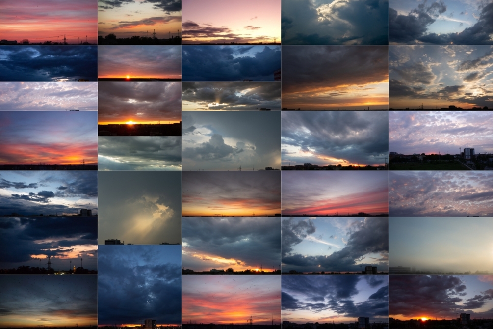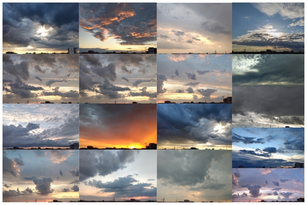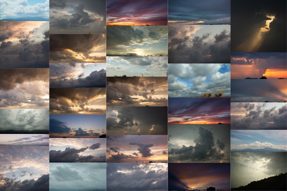 145 photos of skies, collected over the last 3 years. Mostly shot on a Sony RX100 with some phone snapshots among them. Some of the photos are slight variations of each other (different angle, zoomed in for extra detail etc.)